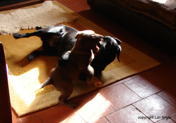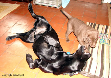 male Labrador enticing a 7 week old male Labrador puppy to play. The